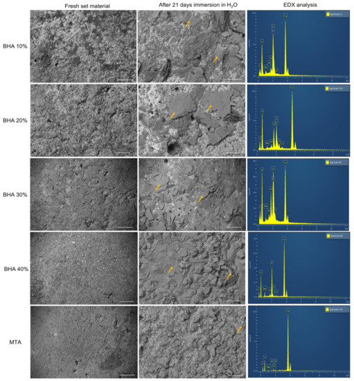 SEM images and their respective EDX analysis of the cements after initial set and 21 days immersion in H2O. Yellow arrows indicate apatite formation. (Error bar = 10 µm).