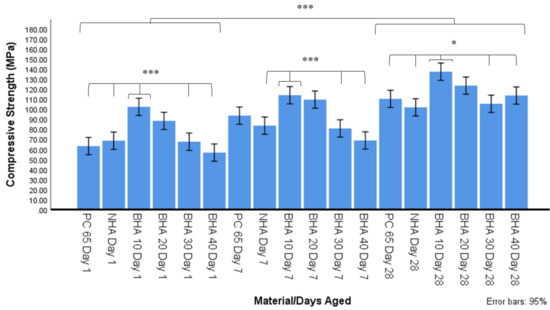 Compressive strength after 1, 7 and 28 days ageing in distilled water using ISO 9917-1 (2007) (n = 10). Significant differences between materials from day 1–28 (p < 0.001), on day 1 between BHA 10% and PC 65, NHA, BHA 30% & 40% groups (*** p < 0.001), on day 7 between BHA 10% and NHA, BHA 30% and BHA 40% (*** p < 0.001), and day 28 between BHA 10 and PC65, NHA, BHA 30% and BHA 40% (* p < 0.05).