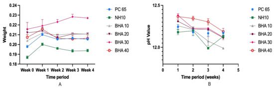 There was no significant change in the mean weight of the materials studied over the four-week period (Figure 6). Furthermore, there were no significant differences in the pH values within the groups over the four-week period. However, except for BHA 10% (pH 11.99) at week four and NHA (pH 11.96) at week three, all groups maintained an average pH above 12 over the entire test period. The mean pH of NHA (11.96) at week three was significantly lower than the mean pH of BHA 30% at week one (12.38, p < 0.024), and BHA 40% at week one (12.39, p < 0.034).