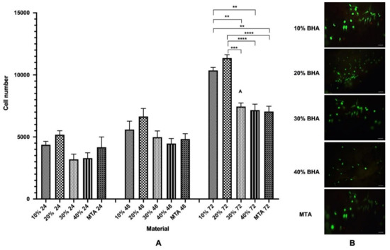 The cell proliferation and biocompatibility of the BHA cements and MTA were investigated using the MTS assay. The cell numbers increased with time and both the BHA cements and MTA materials were, therefore, considered to be biocompatible for the Saos-2 cells (Figure 6A). Notably the 10% and 20% BHA cements presented higher cell numbers across all three time points compared with MTA, which acted as the control. According to Figure 6A, there was no significant difference observed in cell numbers between the BHA cements and MTA at 24 h and 48 h (ANOVA; p = ≤ 0.05). However, there was a significant difference between 10% BHA and MTA (ANOVA; p = 0.01), and 20% BHA and MTA at 72 h (ANOVA; p = <0.0001).