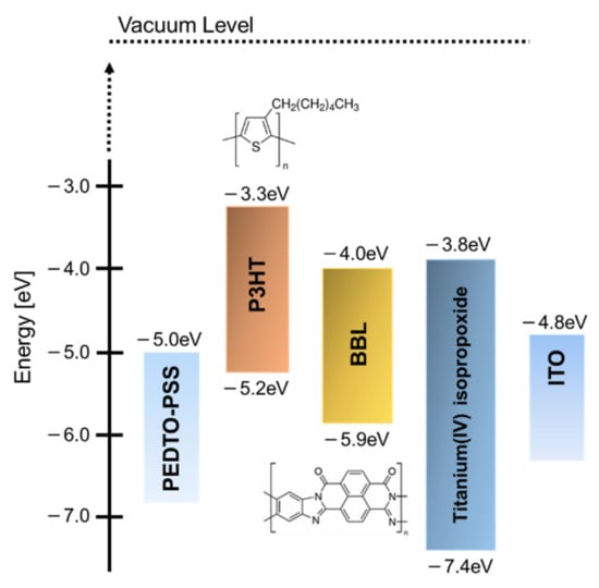 - Manoj, A.G.; Narayan, K.S. Photovoltaic Properties of Polymer p-n Junctions Made with P3OT/B.B.L Bilayers. Opt. Mater. 2003, 21, 417–420. [Google Scholar] [CrossRef]