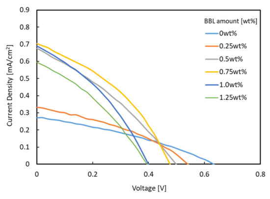 | Category | BBL Amount [wt%] | Jsc [mA/cm2] | Voc [V] | Fill Factor | PCE [%] |
