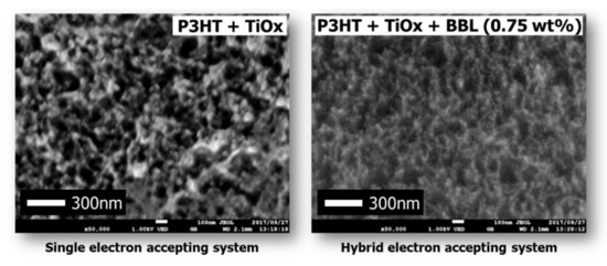 - Kato, T.; Hagiwara, N.; Suzuki, E.; Nasu, Y.; Izawa, S.; Tanaka, K.; Kato, A. Morphology Control for Highly Efficient Organic–Inorganic Bulk Heterojunction Solar Cell Based on Ti-Alkoxide. Thin Solid Films 2016, 600, 98–102. [Google Scholar] [CrossRef]