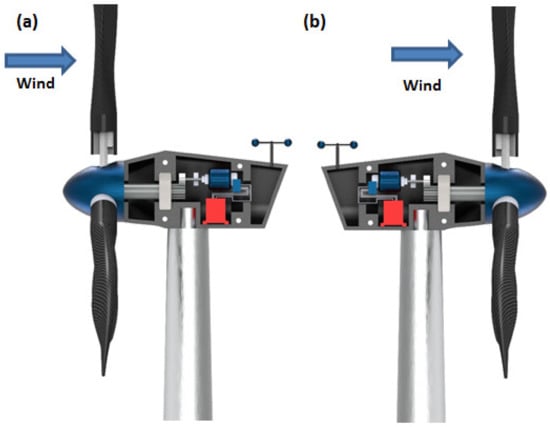 Figure 1. (a) Upwind HAWT (when wind is coming from the front side of the turbine blades); (b) Downwind HAWT (when wind is coming from the back side of the turbine blades). - Vertical Axis Wind Turbines: This type of turbine has the turbine mounted on the shaft, which doubles up as the tower of the turbine structure and the rotor’s blades are vertically placed aerofoil sections. However, various designs of VAWTs are available, like Darrious and Savonious rotor turbines [30]. The installation and maintenance of these types of turbine are relatively cheaper and easier than other types. Since the turbine blades do not have to clear the distance between the ground and the hub of the rotor, the length of the tower can be kept short, which also helps to reduce the vibration of the shaft due to the rotating mass. However, the shaft does not need to hold the weight of the entire gearbox and control mechanisms as those components are placed at the base of the shaft near the ground. VAWTs are subjected to varying wind loads, differing with the height of the blade. Higher wind loads are experienced at the top of the turbine than the loads experienced at the bottom, rendering lower energy conversion efficiency. Thus, their uses for high-power application are restricted commercially.