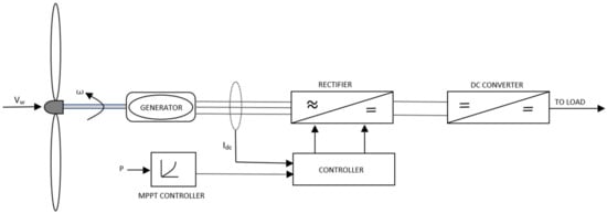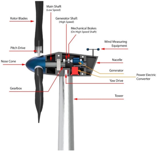 Electrical components are separated into two segments, some of which are located inside the nacelle alongside the mechanical components, while others are placed on the ground away from the tower. The chief function of the electrical subsystem is to convert the mechanical energy gathered from the wind as torque and speed into electrical energy. A block diagram of a typical grid-connected WECS is depicted in Figure 4 [28]. The step by step conversion begins with the generator, power electronic converters, transformer, wind farm collection point, and power channels etc.