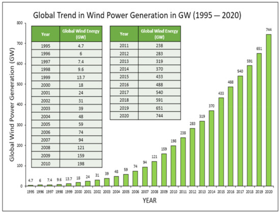 - World Wind Energy Association. Worldwide Wind Capacity Reaches 744 Gigawatts—An Unprecedented 93 Gigawatts Added in 2020; Press Release, Statistics; WWEA: Bonn, Germany, 2021. [Google Scholar]