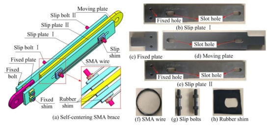 As shown Figure 1, self-centering SMA braces mainly include three parts: a slip component, a fixed component, and SMA wires. The slip component is composed of a moving plate, slip plate I and slip plate II, which are connected by slip bolt I and slip bolt II. The fixed component is constituted by the moving plate, the fixed plate, and slip plate II, which has a fixed bolt connection. The SMA wires are set on both ends of the two slip bolts to provide the energy dissipating capacity and elastic restoring force, which provides the special property of superelasticity. Moreover, rubber shims are placed on both sides of the slip shim to reduce the friction coefficient, and the slip bolt passes through the moving plate, slip shim, slip plateI, slip shim, and slip plate II in sequence. It is suggested that the fixed shims be installed between the moving plate and fixed plate and slip plate II. In addition, two slot holes are located at both ends of the moving plate, and there are two slot holes in the same position on slip plate II and on the fixed plate.