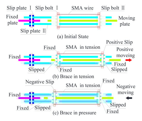 (a) initial state, (b) brace in tension, (c) brace in pressure, Work principle of self-centering SMA brace.