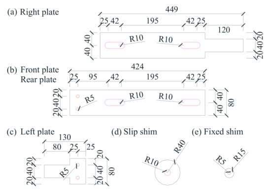 (a) right plate (b) front plate/rear plate (c) left plate (d) slip shim (e) fixed shim. Details of the self-centering SMA brace.