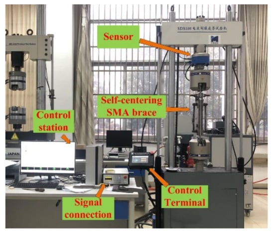 The cyclic loading test was carried out using an SDS100 fatigue test machine at the Engineering Mechanics Experiment Center, Nanchang University. The test setup was composed of four parts: the sensor, control station, control terminal, and signal connection, as shown in Figure 6. The maximum hydraulically driven load that the SDS100 can apply is 100 kN, which is applied with a precision of 0.01 kN. The lower fixture and upper fixture were connected to the fixed plate and slip plateI of the self-centering SMA brace, respectively. The load and displacement of the test specimens were directly recorded by the sensor. All tests were conducted at 27 °C.