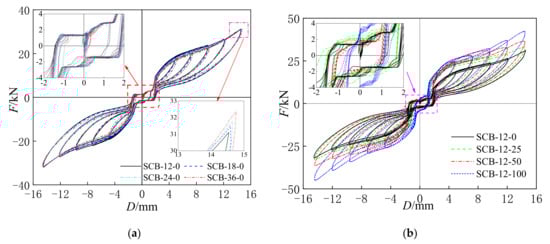 - Effect of initial strains: The hysteresis curves of the SCBs with different initial strains are shown in Figure 7b. The maximum axial forces F of the SCBs were 31.08 kN, 33.21 kN, 36.80 kN, and 42.24 kN at the loading rates of 0.25%, 0.50%, 0.75%, and 1.00%, respectively, which significantly increased as the initial strain increased. In addition, the results also indicate that the residual deformation D1 at the loading rates of 0.25%, 0.50%, 0.75%, and 1.00% were 1.97 mm, 1.89 mm, 1.69 mm, and 1.53 mm, respectively, which was mainly caused by the increase in the initial stress and ultimate stress of the SMA wires [].