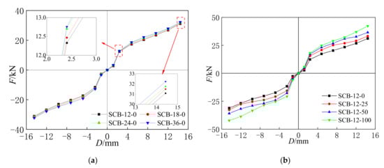 - Effect of loading rates: Figure 7a plots the hysteresis curves of the SCBs with different loading rates. It can be seen that the maximum axial force F and residual deformation D1 are 31.08 kN, 31.49 kN, 31.75 kN, 32.23 kN and 1.97 mm, 1.90 mm, 1.87 mm, 1.85 mm at the loading rates of 0.0012 s−1, 0.0018 s−1, 0.0024 s−1, and 0.0036 s−1, respectively. The ultimate axial force increased gradually, and the residual deformation decreased slightly as the loading rate increased.