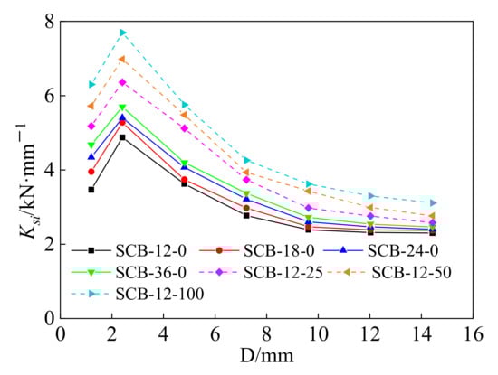 Figure 9 shows the secant stiffness curves of all of the test specimens. The secant stiffness coefficient decreases after reaching the maximum value as the applied displacement increases and the reduction rate gradually decreases. The initial increase in the secant stiffness coefficient is mainly because of the slip friction of the slip components. In addition, as the loading rate and initial strain increase, it can be seen that the secant stiffness coefficients of the self-centering SMA braces increase gradually.