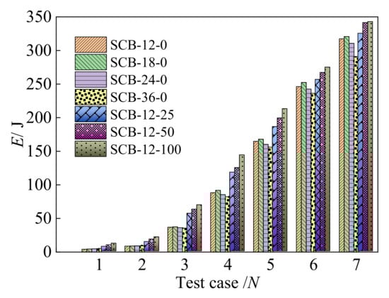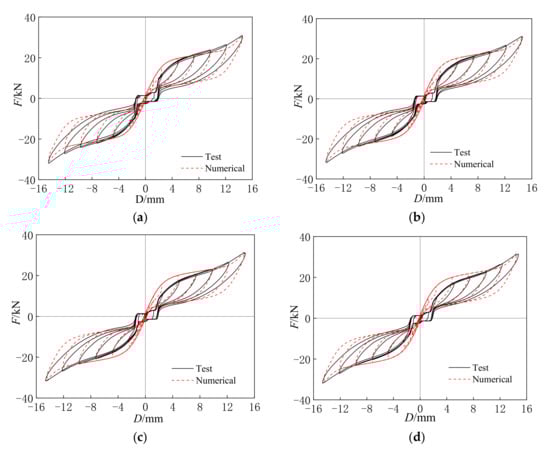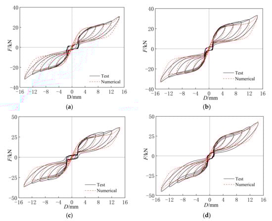 Figure 15 shows the comparison between the test and numerical results under different initial strains at the applied displacements ranging from 2.40 mm to 14.40 mm. At the displacements of 2.40 mm and 4.80 mm for specimens SCB-12-0, SCB-12-25, SCB-12-50, and SCB-12-100, an obvious contrast between the test and numerical results can be observed, and the cause of the contrast is the same as it is with the loading rates. As the displacement increased from 7.20 mm to 14.40 mm, the hysteresis curves of the specimens obtained by the test results all show close agreement with the numerical results.