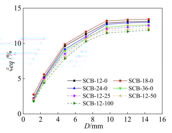 For all of the test specimens, the equivalent damping coefficient during the loading-unloading process is presented in Figure 12. The equivalent damping coefficient of all of the specimens increases as the applied displacement increases. For the specimens with different loading rates, the equivalent damping coefficient of specimen SCB-18-0 is higher than that of specimens SCB-12-0, SCB-24-0, and SCB-36-0; this is mainly caused by the hysteresis area and energy dissipation value. Compared to specimen SCB-12-0, SCB-12-25, SCB-12-50, and SCB-12-100 have a larger maximum axial force F and nearly the same energy dissipation value Ei, resulting in a lower equivalent damping coefficient as the initial strain increases.