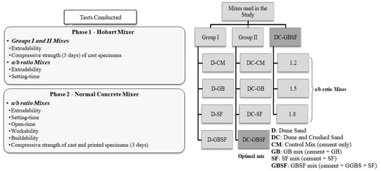 The experimental investigation involved two phases of evaluation. Phase 1 involved mix optimization while phase 2 involved property evaluation of printing concrete. In phase 1 evaluation, two groups of mixes were developed to evaluate the effect of different supplementary cementitious materials (SCM) on the extrudability of the printing concrete as well as the compressive strength of cast specimens. The optimal mix of the two groups was selected and developed with three different aggregate-to-binder (a/b) ratios, and the setting-time of the three mixes were determined. Phase 1 is considered only a preliminary stage and, thus, the mixes were produced on a small scale using a Hobart mixer. For phase 2 evaluation, the main objective was to evaluate the effect of different aggregate to binder (a/b) ratios on the fresh printing properties. The evaluation criteria included the extrudability, setting-time, open-time, workability, and buildability, as well as the compressive strength of cast and printed specimens to indicate the concrete strength. Since this stage involved the evaluation of several properties, a conventional concrete mixer was used for the production of a larger-scale mixing to satisfy volume requirements.