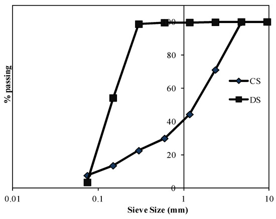 CEM-I 42.5-R0 and GB complying with BS EN 197-1:2011 [29] and EN 15167-1:006 [30], respectively, in addition to a commercial silica fume with 15,000 m2/kg Blaine fineness, were used in this study. Dune and crushed sand with fineness modulus of 0.48 and 3.2, respectively, were used with a maximum aggregate size of 4.75 mm. Note that these types of sand were selected in the present investigation as these are the commonly used types of fine aggregates in the UAE. The particles size distribution of the aggregates is illustrated in Figure 2. Table 2 summarizes some of the properties of the materials used in the current investigation.