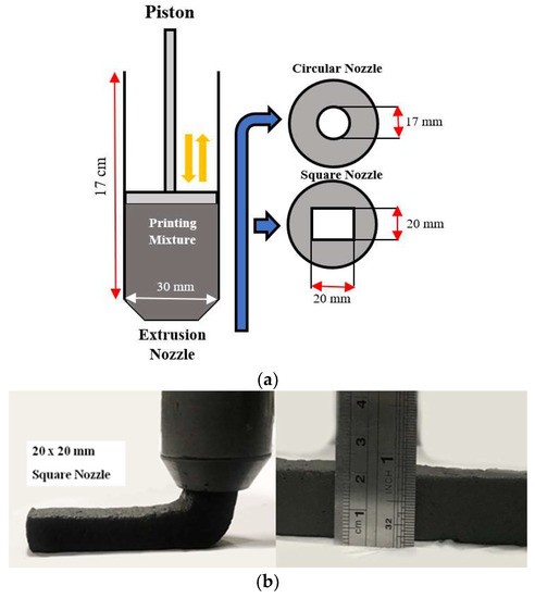 A custom-made 3D printer nozzle was manufactured to simulate an extrusion-based 3D printing process. A piston-type extruder was used, and moderate external vibration was applied to ensure that the mixture is adequately compacted inside the extruder. Once the mixture is filled in the 17 cm circular tube manually, the piston is used, and manual extrusion is performed to print the mortar layers. The pressure was kept constant throughout the extrusion process, and the printing rate was approximately 4.2 cm/s. Two nozzles were used, a circle nozzle with a diameter of 17 mm and a square nozzle with dimensions of 20 × 20 mm. Figure 3a demonstrates a schematic diagram of the nozzle, while Figure 3b demonstrates the extrusion process of the square nozzle.