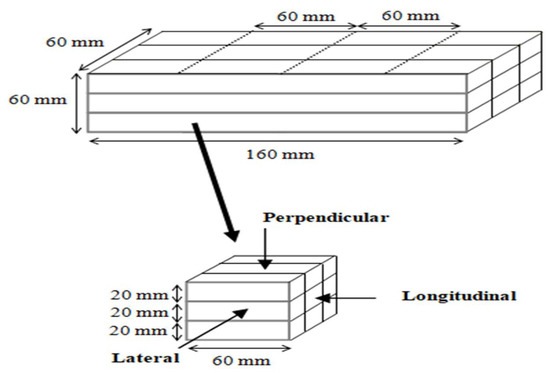 The compressive strength was performed on all mixes of phase 1 and 2 evaluations. In phase 1, the strength of cast specimens of the two groups was tested at 3 days to have an indication of the concrete compressive strength while choosing the optimum mix. In phase 2, the compressive strength of both cast and printed specimens was performed mainly to indicate the effect of the layering process on the concrete. The compressive strength was performed as per ASTM C109-20 [38]. The cast specimens had a cube size of 50 × 50 × 50 mm, and three specimens were tested for each mix. The dimensions of the printed specimens were 60 × 60 × 60 mm, which were prepared from 160 × 60 × 60 mm printed samples, as shown in Figure 5. At least two specimens were tested in the perpendicular direction for each mix.