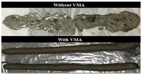 The extrudability of the D-CM and D-GB mixes was the most difficult to adjust. Several trials were performed to achieve acceptable extrudability of the control mix (D-CM). VMA was initially not used in the control mixes to prevent additional costs. This mix failed as it was too stiff to extrude through the nozzle. Additional superplasticizer was added to adjust this mix; however, segregation occurred as a result and the mix became too flowable which led to blockage. Most of the mixes segregated or became unstable when either the water-to-binder ratio or the SP were increased; however, when VMA was used, segregation did not occur and extrudability was achieved, as shown in Figure 6. The VMA dose used in this study was 0.24% by total weight of fines. Similarly, the D-GB mix was also difficult to extrude, and the use of VMA was essential to adjust its extrudability. This mix was to an extent easier to extrude than the D-CM mix. The increased cohesiveness achieved by the addition of GB improved the extrudability performance. Moreover, the SP dosage used to adjust the extrudability of the D-GB mix was lower than that of the D-CM mix. This was expected as, unlike cement, only a few water molecules get absorbed by the GB particles due to their dense surface, thus enhancing its workability [3,39].