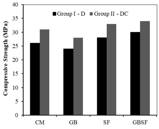 The results also show that the printed specimens exhibited lower strength than that of the cast specimens, which is in line with previous studies [41,42,43,44]. One of the possible justifications to the strength reduction could presumably be due to the time required to print the cubes. Although the cube printing occurred during the open time, the bonding between the layers may have weakened. This denotes that the open time of printing concrete should be selected as the time, which also maintains sufficient interlayer strength. Another probable reason for the strength reduction could have been due to the imperfect shape of the cube. While extracting the 60 mm cubes from the 160 × 60 × 60 mm printed samples, the cube edges were slightly sloping. This might have contributed to the reduced strength of the printed specimens.