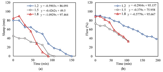Structuration rate: The slopes of the curves shown in Figure 9 demonstrate the rate at which workability was lost with time. The rate at which the mixes stiffened indicates the structuration rate. The slopes of the 1.2, 1.5, and 1.8 mixes for the slump (Figure 9a) were found to be −0.59, −0.42, and −1.09, respectively, which can be read from the equations of Figure 9a. The steeper the slope, the higher the structuration rate, and vice versa. From the results, the 1.5 mix showed a lower slope (−0.42) than that of the 1.2 mix (−0.59), indicating that the structuration rate for the 1.2 was higher than that of the 1.5 mix. This was unexpected, as the aggregate to binder ratio is a factor that affects the structuration rate of the mixes, and it is expected that, as the a/b ratio increases, the structuration rate should also increase. Thus, this suggests that the slump test may not always provide accurate results.