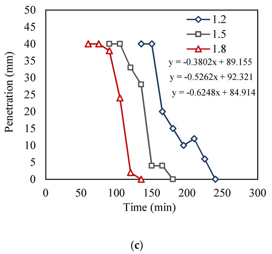 Figure 9b, on the other hand, showed that as the a/b ratio increased, the slopes became steeper, i.e., the structuration rate increased with the increase in a/b ratio. Similar to the flow time results, the penetration time results also showed that as the aggregate-to-binder ratio increased, the structuration rate increased, as depicted in Figure 9c.