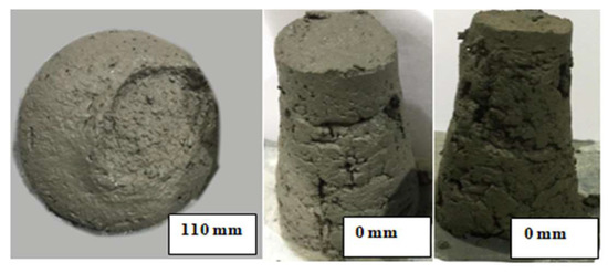 Concrete with higher slump values (>90 mm) led to unstable filaments. As for the 0 slump, there were times at which the 0 slump provided acceptable extrudability and times at which the filaments were discontinuous and difficult to extrude. Hence, it can be concluded from the slump results that the slump only provides an indication of the extrudability, consistency, and homogeneity of the concrete, and cannot be completely relied on to evaluate the workability of the printing concrete. Extrudability has to be within a slump ranging from 85 to 9 mm; however, it is worth noting that these values will not always necessarily cause the concrete to pass the extrudability criteria, and hence other test methods should be proposed to evaluate the workability of the printing concrete. Figure 10 demonstrates concrete with a 110 mm slump, which failed the extrudability criteria, as well as 0 slump after the open time of the mixes were exceeded. It is clear that at this stage, the concrete lost some of its plasticity and will no longer produce concrete with the acceptable printing quality. Even if the concrete was extruded, cold joints may occur, and bonding between the layers may be very weak. Therefore, the lower range of the workability should also account for the adequate bond strength between the printed layers.