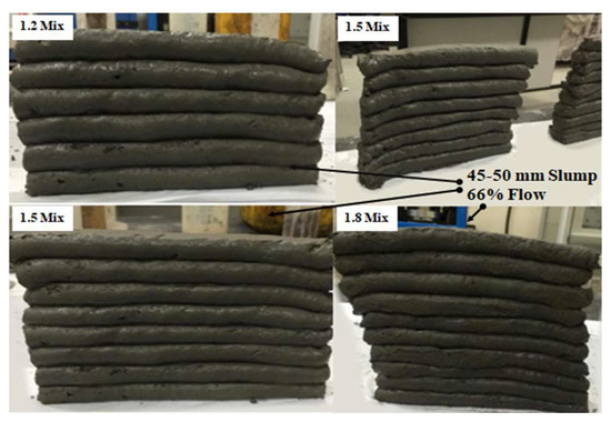 It is worth mentioning that the workability of the mixes had to be adjusted to satisfy the buildability requirement. The computed slump and flow range to maintain printability were found to be within the ranges of 85 to 9 mm and 90.6 to 56%, respectively. These values provide good extrudability performance but do not satisfy the buildability requirement. The buildability demonstrated in Figure 12, Figure 13 and Figure 14 corresponded to slump and flow ranges of 45–55 mm and 66–60%, respectively.