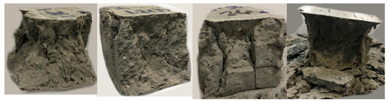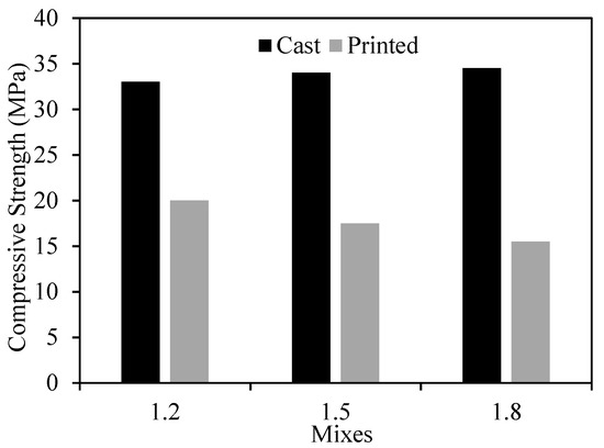 The strength of the cast specimens of the 1.2, 1.5, and 1.8 mixes were 33, 34, and 34.5 MPa at 3 days, and 44.3, 52, and 53.8 MPa at 28 days, respectively. The results show that the compressive strength increased with the increase in a/b ratio. In Figure 15, the testing of the 3 × 3 layer cube is illustrated. The compressive strength of the cast and printed specimens at 3 days is presented in Figure 16. Figure 17, on the other hand, shows the failure modes of the printed specimens. As observed, the layering process in this study did not affect the failure modes of the concrete cube specimens, and most exhibited a semi-explosive failure mode. The specimens witnessed acceptable failures that are similar to those of the cast specimens. Moreover, debonding was not detected between the layers of the printed cubes upon compression.