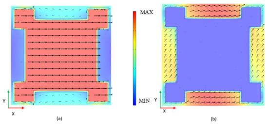 The generation of the band gap can be explained according to the coupling effect between the vibration mode of the structure unit cell and the elastic wave propagation [57,58,59,60,61,62,63]. In this section, we analyze the vibration modes of the unit cell in boundary frequencies of band gaps to explain the starting and termination of each band gap.