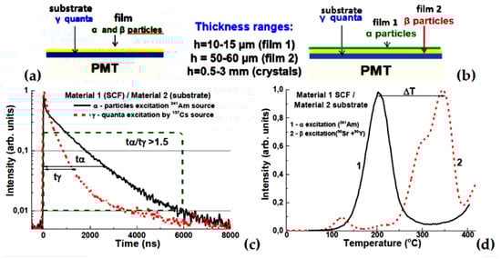 Scheme of a two-layer (a) and three-layer (b) composite scintillator or TL material, (c)—example of the scintillation decay of the film and substrate parts of composite scintillator at registration of α-particles and γ-quanta [14], (d)—example of recording ΔT temperature difference between the main peaks in TL glow curves of the film and substrate in a composite TL material [25,26].