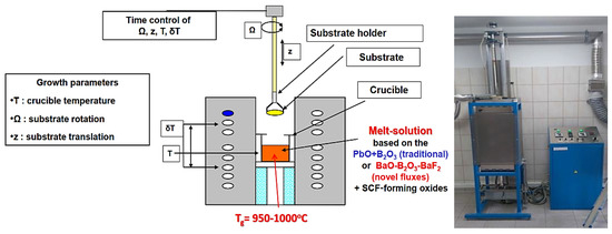 The basic mechanism determining the formation of a single-crystalline film onto the substrate is the process of supercooling the solution. For this purpose, a crucible is placed in a furnace (Figure 3) and heated to a temperature of 1050–1100 °C. At this temperature, the melted materials form an unsaturated solution characterized by a certain saturation temperature TS (solidus temperature), which is a function of the R3 coefficient. As solution temperature is lowered below TS to growth temperature Tg in the 950–1050 °C range, the solution undercools, and the excess solute deposits on the rotating substrate introduced into the solution.
