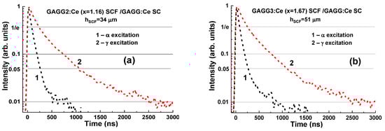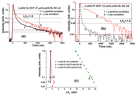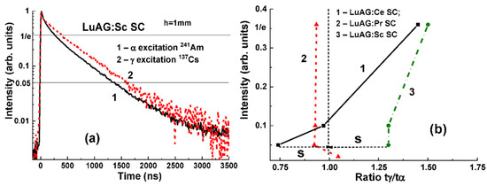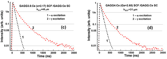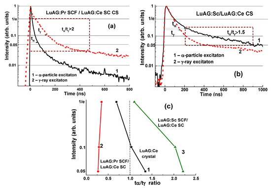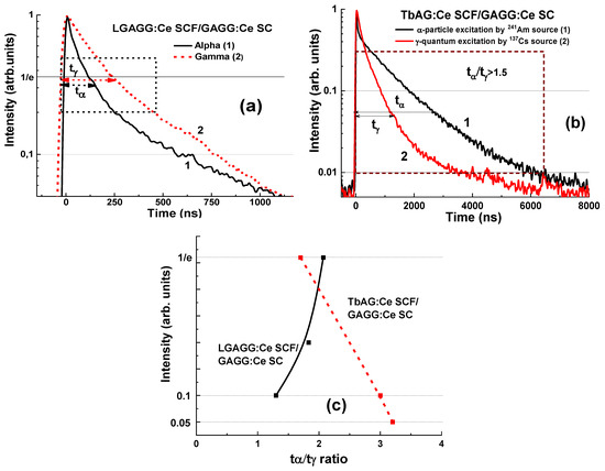 The remarkable differences in the scintillation decay of LuAG:Pr SCF/LuAG:Ce SC and LuAG:Sc SCF/LuAG:Ce SC composite scintillators are observed under γ-rays and α-particles with a tα/tγ value ranging within 0.27–0.35 and 1.1–2.2, respectively, at luminescence-intensity decay from 1/e down to 0.05 (Figure 6c) [15,16].