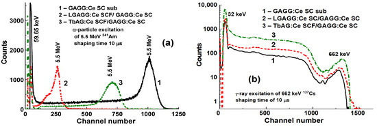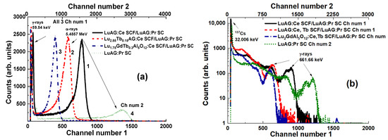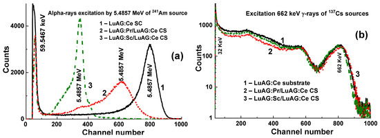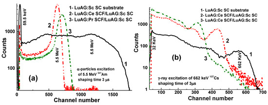 LuAG:Pr SCF/LuAG:Ce and LuAG:Sc SCF/LuAG:Ce composite scintillators were developed in [15,16]. Features of α-particle and γ-quantum interaction with the mentioned materials cause a big difference in scintillation efficiency at their registration, expressed by the ratio LYα/LYγ. Figure 5 shows PHS of these composite scintillators under excitation by α-particles and γ-quanta. The main peak in Figure 5a corresponds to the full absorption of α-particles with a 5.5 MeV energy, while the left peak is associated with the absorption of γ-quanta of a 137Cs source with an energy of 59.65 keV. It is important that the positions of the peaks corresponding to α-particle excitation of LuAG:Pr and LuAG:Sc SCFs are different from those for the LuAG:Ce SC substrate (Figure 5a). This means that α-particles are registered only by the SCF and do not excite the substrate.