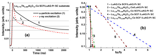 (a)—scintillation decay of Lu0.715Tb2.285Al5O12:Ce SCF/LuAG:Pr SC composite scintillator (b) under excitation by α-particles (1) and γ-quanta (2). (b)—tγ/tα ratios for the different levels of luminescence-intensity decrease for Lu3−xTbxAl5O12:Ce SCF/LuAG:Pr SC composite scintillators with the Tb content x = 0 (1), 0.65 (2), 1.65 (3), 2.15 (4), and 2.285 (5) [17].