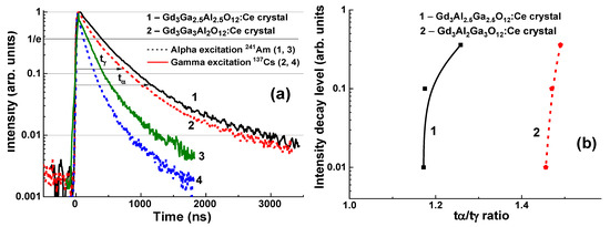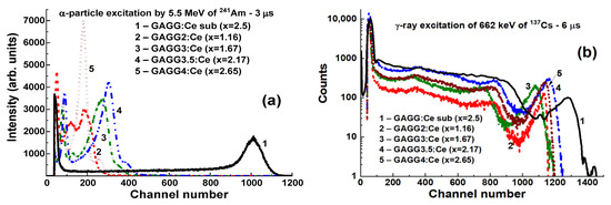 There were two types of the available Gd3Al5−xGaxO12:Ce substrates with x = 2.5 and 3 and a thickness of 1 mm. The scintillation decay curves of these substrates under excitation by α-particles and γ-quanta are presented in Figure 11. It was observed that the scintillation decay of substrates under γ-quanta excitation is systematically faster than that under α-particles, which is caused by a specific interaction of these radiations with the scintillator material. The difference in light yield of the GAGG:Ce substrates at these excitation types expressed by the LYα/LYγ ratio is in the range of 0.195–0.2 [20,22].