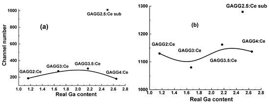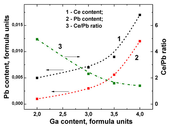 It is well known that the Pb2+ ion is a very effective quencher of Ce3+ luminescence in garnets and other oxide compounds, negatively affecting their scintillation properties [3,22,27,28,29,64]. The increase in Pb2+ contamination and Ce3+ concentrations in GAGG:Ce SCFs is stimulated by an increase in the dodecahedral site volume for localization of the relatively large Pb2+ ions [22,59,60,62,63,64]. Indeed, as can be seen in Table 2 and Figure 13, the lead content of Gd3Al5−xGaxO12:Ce SCFs is relatively high and increases steadily with Ga content. For this reason, the Ce3+/Pb2+ ratio in Gd3Al5−xGaxO12:Ce SCFs is 1.4–5, while typical values are 15–17 (Figure 13) [22,62,63,64].