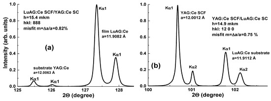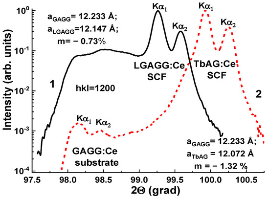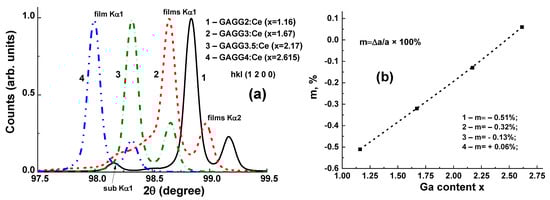 The structural quality of Gd3Al5−xGaxO12:Ce SCFs with different Ga concentrations was studied, as well as the lattice constant of SCF samples and the misfit between the lattice constants of SCFs and GAGG:Ce substrate Δa = (aSCF–asub)/asub*100% (Figure 14). The lattice constant of Gd3Al5−x GaxO12:Ce SCFs in the 12.168–12.235 Å range and m value in the −0.51% < m < +0.06% range depend linearly on the Ga x content in these samples. It should be noted that such small mismatch values are very suitable for the deposition of SCF scintillators with high structural and optical quality.