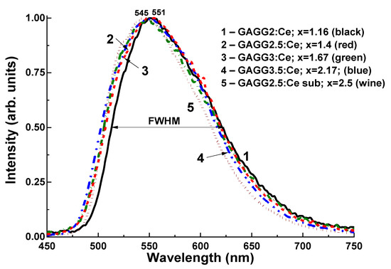 Garnets hosts were chosen for development of composites due to their relatively easy growth process in both bulk and film forms. The cubic structure of garnet implies fewer limitations on the film orientation. If considering just “simple” rare-earth garnets, the heaviest Lu3Al5O12 (LuAG) host should be chosen as a substrate [13,14,15,16,17,18,40,41,42,43,44], while the film should comprise lighter Y3Al5O12 (YAG)-based compositions [1,9,13]. The luminescence signals from LuAG and YAG can be distinguished by doping them with different activators having various luminescence lifetimes, such as Pr3+ (15–25 ns), Ce3+ (40–70 ns), or Sc3+ (245–610 ns) in garnet hosts [15,16,40,41,42,43,44], or using the property of faster luminescence decay in films than that in bulk crystals with the same composition due to lower quantity of defects in the former.