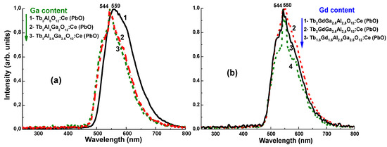 Meanwhile, new prospects in engineering of the garnet composite scintillators have been opened with the development of the bulk crystals of mixed (Lu,Gd,Tb)3(Al,Ga)5O12 garnets possessing much higher light output even over 50,000 photon/MeV [43,44,45]. Nowadays, Ce-doped mixed garnets are among the most extensively developed garnet scintillators [43,44,45,46,47,48,49,50,51,52,53,54,55]. The focus of the recent studies was concentrated on mixed systems with the first (Lu,Gd,Tb) and second (Al,Ga) cation substitutions (Figure 2a). An effect of a nonlinear decrease in the conduction and valence band minima relative to the vacuum referred binding energy with Ga doping in (Lu,Gd,Tb)3(Al,Ga)5O12 garnets was studied in details [43,46]. The change matrix composition also affects the characteristics of Ce3+ emission in mixed garnets [43,46,47]. Generally, the substitution of Lu3+ cations by the large R = Gd3+ or Tb3+ ions in the (LuxR1−x)3Al5−yGayO12:Ce lattice results in a red emission shift and in increased splitting of the lowest doublet 5d state of Ce3+ with respect to conduction band bottom (Figure 2b), as well as in changing the rates of intra-center and extra-center energy relaxation to Ce3+-emitting ions [48,50]. Finally, such double cation substitutions lead to strong increasing LY mixed garnet scintillators with respect to “simple” LuAG:Ce and YAG:Ce garnets [43,50,55].