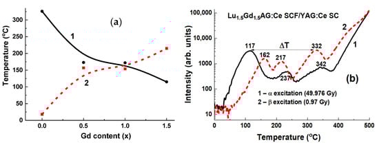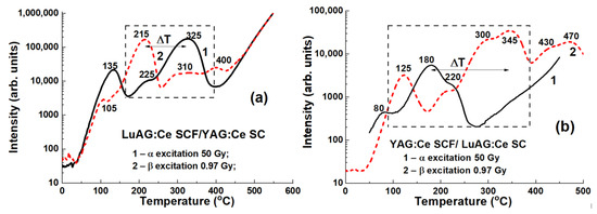Finally, the last part of this review demonstrates the possibility of developing composite TL detectors based on garnet epitaxial structures. Among possible compounds, YAG:Ce and LuAG:Ce crystals and SCFs of these garnets, as well as Lu3−xGdxAl5O12:Ce SCFs, were considered [23,24]. The operation principle of such composite TL materials is based on differences in temperatures of main peaks in glow curves corresponding to SCF and SC components under excitation with α- or β-particles (Figure 1b). Therefore, developed garnet epitaxial structures can be considered as prototypes of composite TL detectors.