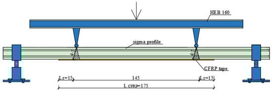 The adhesive was prepared in accordance with the manufacturer’s instructions, and reinforced beams were subjected to load after a minimum of 7 days from gluing the CFRP tape, in order to obtain full adhesive bond strength. Adhesive thickness was 1.3 mm. The CFRP tape length was 175 cm. All beams were subjected to testing under a four-point bending system. The laboratory stand photo is shown in Figure 2. The Zwick Roel (Zwick Roell GmbH & Co., KG, Ulm, Germany) testing machine at the Construction Laboratory of the Lublin University of Technology was used in order to perform experimental tests. Figure 3 shows a laboratory stand diagram, studied beam cross-section, CFRP tape location, the distribution of the analyzed measuring points for displacement (P), and electrofusion strain gauges (T).