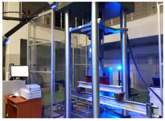 In the course of the test, the beams were bent and twisted. As a result, the Tritop and Aramis systems were used to correctly measure the displacements. Vertical displacements were measured at points P3 and P4 located in the middle of the beam span. Strains were measured using electrofusion strain gauges (type TENMEX TFs-10 with 120 Ω ± 0.2% resistance) marked T2 and T3, in the middle of the beam span.