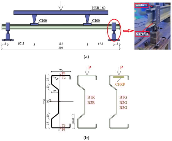 When conducting literature studies on reinforcing thin-walled steel structures using CFRP materials, one can find a very limited number of publications, most of which focus on studying compressed elements. For example, Bambach, M.R. [1] described a study of thin-walled steel elements of a square section reinforced with CFRP on the outside. The experiment was conducted at quasi-static axial compression, in order to determine the impact of the applied reinforcement on the increase in compressive strength. It was also conducted for an axial impact. The work effort focused on testing the impact of reinforcement relative to dynamic axial compression and associated impact resistance indicators (against axial compression). Park, J.W. et al. [2] studied the behaviour of axially compressed thin-walled square steel columns that were reinforced with CFRP. In total, their research involved eight samples. Based on the obtained results, the researchers concluded that reinforcing the entire cross-section with three CFRP layers with fibers, arranged transversely to the force direction, enabled the increase of the maximum load by 33%. They also developed FEM models that confirmed the increased rigidity of reinforced columns. Imran, M. et al. [3] also studied axially compressed thin-walled columns with a square cross-section. They used a reinforcement in the form of CFRP mats glued around the entire section, and demonstrated that strengthened samples were able to transfer a load that was 2.6 times higher, relative to non-reinforced samples, than the compressive force, until first local buckling cases appeared. In order to conduct more comprehensive analyses, they also developed a numerical model in Abaqus software. The behaviour of axially compressed cold-bent square sections reinforced with CFRP is described in [4]. Within the study, composite material was glued in layers around the cross-section, so that the fibres in the first layer were perpendicular to the load direction, and parallel in the second layer. The obtained results indicated that the application of CFRP significantly delayed local buckling, and elastic buckling strength was increased even four-fold. The information contained in the paper is an extension of similar studies described by Bambach, M.R. et al. [5]. The authors described a design method for the determination of the axial compressive strength of elements circumferentially reinforced with CFRP, the results of which indicated compliance with 45 samples subject to laboratory testing. As emphasized by Bambach, M.R. [1], the motivation behind reinforcing thin-walled steel structures using CFRP in the case of axial compression [6] is for enabling the control of buckling strains and ensuring increased compressive strength. Silvestre, N. et al. [7], presented a study involving nineteen samples taken from a thin-walled C-section subjected to compression. Seven various CFRP material locations and two fiber arrangements were analyzed. The objective was to study the impact of CFRP on the operation of the element and to determine limit loads that were identified by the appearance of various failure mechanisms. Based on the obtained results, it was concluded that reinforcing the entire C-section enabled them to improve the maximum load by 20% under the test conditions. Tests were used to develop a detailed model in the Abaqus software. A year later, in paper [8], the same authors suggested expanding the design guidelines in Eurocode 3 and AISI-DSM with recommendations regarding the design of compressed thin-walled C-section elements reinforced with CFRP. As it has already been stated, a majority of the cited papers focused on studying elements subjected to compression, whereas in the case of bent thin-walled beams, this number is limited [9,10].