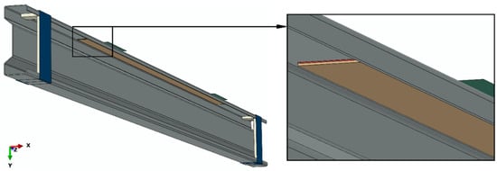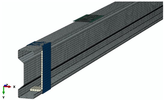 Numerical simulations were carried out on the basis of static calculations. As part of the numerical simulations conducted using the finite element method, a comprehensive discrete model of the structure was prepared, containing the main element of the system, i.e., a sigma steel profile with the dimensions of 200 × 70 × 2 mm and a length of 3000 mm, as well as all components such as supports, stiffening elements in the area of U-shaped supports, composite tapes made of CFRP material, adhesive bonds between the beam and the composite tape, and non-deformable plates transferring loads to the beam. Between the beam and the composite strip where the adhesive layer was located were Tie-type permanent fastener interactions. All elements of the tested system were mapped with due care, so that the numerical simulations were a faithful reflection of the experimental tests. During the numerical simulations conducted with the use of Abaqus® (2021) (Dassault Systemes Simulia Corporation, Velizy Villacoublay, France), discrete models were prepared, which allowed for further comparison of the numerical simulations results with the results of experimental tests. Details of mechanical properties used in the numerical simulation are presented in [9,10]. For the discrete model of the main structure of the sigma steel beam, solid finite elements of the C3D20R type were used, as characterized by the second-order shape function, and the twenty-node-type with reduced integration. The composite tape and U-shaped stiffening elements were modelled using S4R type shell finite elements, as characterized by the first-order shape function, and the four-node-type with reduced integration. The supports and plates transferring loads to the beam were prepared with the use of non-deformable elements of the R3D4 type. The adhesive layer between the composite tape and the corresponding surface of the sigma beam was modelled by COH3D8 cohesive finite elements. The numerical model (Figure 4) was prepared so that the sigma beam (gray) was placed between the non-deformable supports (blue), where channel-shaped stiffening elements (light gray) were inserted in the beam profile adjacent to the supports. Adjacent to the upper flange of the beam were non-deformable plates (green), constituting the loading elements, while both the aforementioned supports and stiffening elements, as well as the non-deformable plates, remained in contact with the sigma beam. Moreover, a composite tape (beige) was attached to the beam through an adhesive bond (red) between the tape and the beam. The system prepared as described above was subjected to numerical analysis (Figure 4).