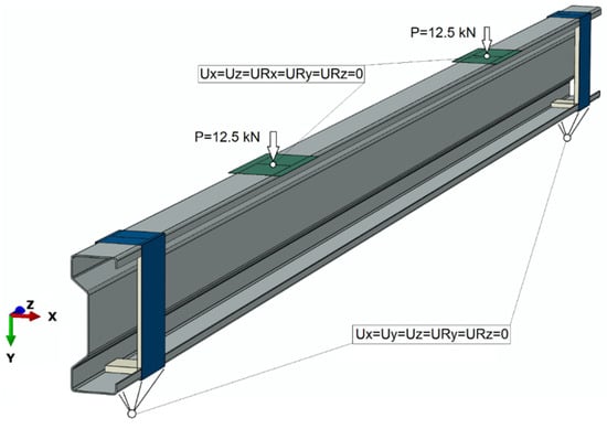Boundary conditions were defined at reference points that were coupled with selected elements of the tested system (Figure 5). The boundary conditions were defined on the basis of receiving certain degrees of freedom of selected system elements, which enabled the mapping of the actual behavior of the sigma beam structure. The loads of 12.5 kN were assigned to both non-deformable plates transferring loads to the main beam structure, which corresponded to the actual load carried out through experimental tests.