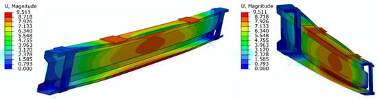 During laboratory tests, in the majority of the beams, the CFRP tapes detached from the beams after exceeding the load of 25 kN. Therefore, the load of 25 kN was considered as a destructive force, and at this load level, the results of displacements and strain obtained in individual samples during laboratory tests and in subsequent numerical models were analyzed. Table 1 shows the values of displacements and strain of individual models and laboratory samples with a load value of 25 kN. The table also includes the results obtained by reference beams in order to present the benefits of using CFRP tape reinforcement. Figure 7 presents an example of the displacement distribution obtained by means of the numerical model, in which the thickness of the adhesive layer was equal to 0.65 mm.