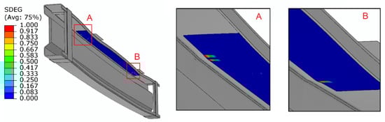 Furthermore, as part of the numerical tests, the scope of damage within the adhesive layer was also analyzed. For numerical simulations, the SDEG (stiffness degradation) parameter was used in order to assess the adhesive stress distribution, which allowed for the description of the adhesive layer damage. When this parameter was set to 1, it meant that this connection in a given area was damaged. In the case of the conducted research, it was observed that the adhesive layer was initially damaged adjacent to the areas to which the load was applied. It was estimated that the adhesive layer began to fail at a load of 26.94 kN for a 0.65 mm adhesive layer, 24.4 kN for a 1.3 mm adhesive layer and 23.7 kN for a 1.75 mm adhesive layer. For the purposes of better visualization of the damage to the adhesive layer, the composite tape that lied directly on the adhesive layer was not involved in the visualization (see Figure 8).