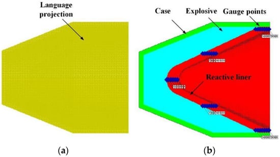 The main charge is the 8701 explosive, and its EOS is expressed by the JWL equation. Table 3 represents the parameters of 8701. The simulation model is shown in Figure 1.